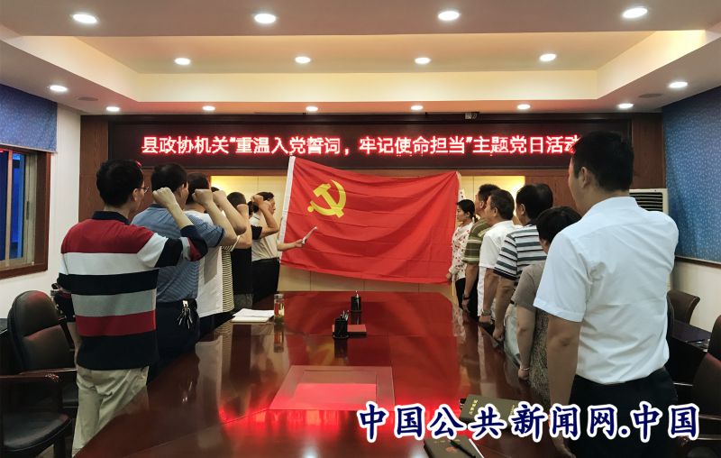 会上,县政协机关全体党员,在县政协副主席楚子良的带领下,在党旗前集体宣誓,重温入党誓词。
