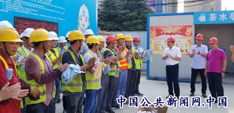全民公众讯(胡颖 刘勇)7月24日上午蒙城县总工会开展“夏送清凉”活动,正值夏季高温天气,蒙城县住房与建设委员会主任张明生;蒙城县委常委、县委宣传部长、县总工会主席王占峰;蒙城县总工会党组书记、副主席郑士辉;蒙城县总工会党组成员、副主席郭从东等一行来到中建二局蒙城县南华苑北区项目部为广大冒高温、战酷暑,坚守岗位、辛勤工作的一线工友送去了精心准备的矿泉水、香皂、毛巾等防暑降温物品。并与他们亲切交谈,叮嘱他们在认真工作的同时要保重身体。