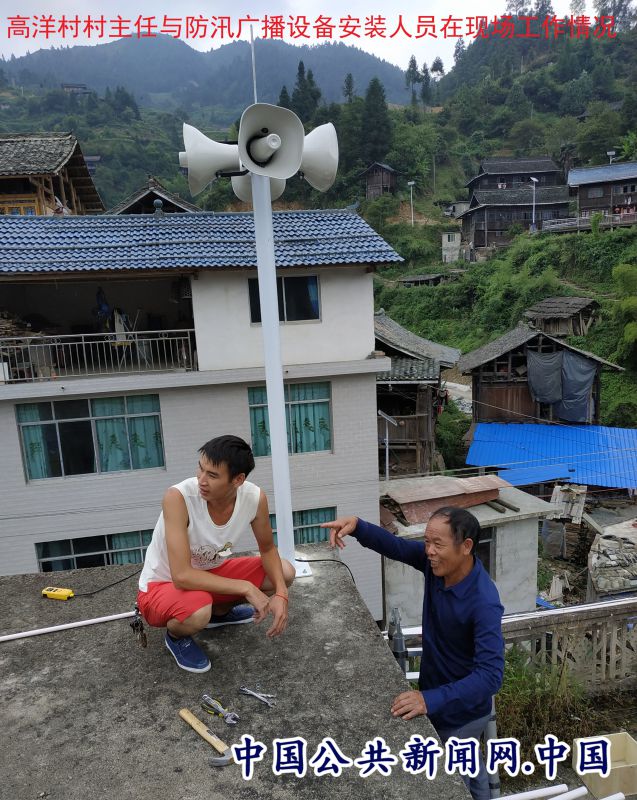 高洋村村主任与防汛广播设备安装人员正在安装无线预警广播系统。