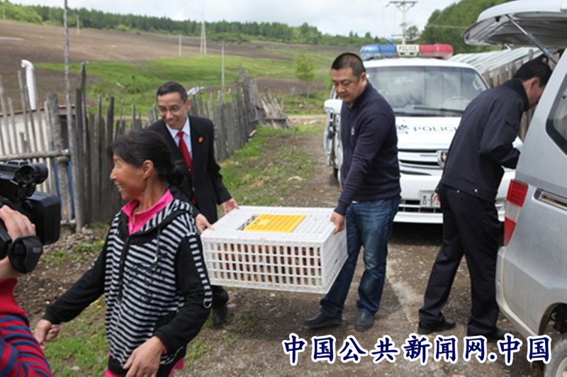 图为长白县法院班子成员购买“九斤红”成年龄雏鸡80余只,挨家挨户送到不能从事重体力劳动村民家里。