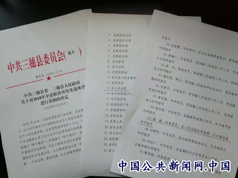 全民公众讯(蒋昌进)近日,三穗县法院在全县减贫摘帽“百日攻坚”推进会上被县委、县政府表彰为“2018年度脱贫攻坚优秀帮扶单位”,该院驻长吉镇地盛村干警杨毅同志被县委、县政府表彰为“2018年度脱贫攻坚优秀网格员”。