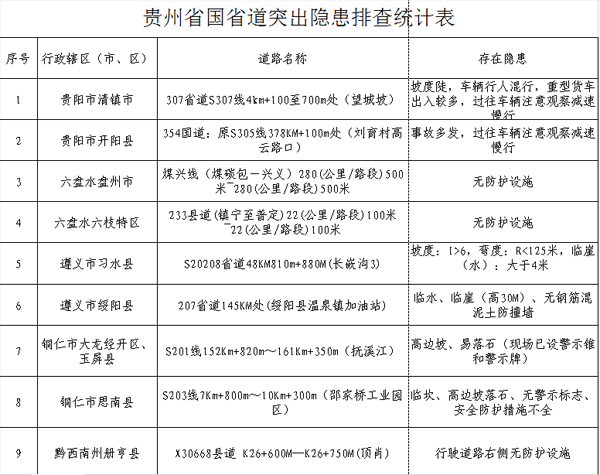 冬季雨雾增多,团雾、凝冻等恶劣天气多发,为进一步预防道路交通事故的发生,贵州交警对全省高速公路、国省道、农村道路等事故多发路段进行了隐患排查,共排查出年均发生3次以上团雾路段200处,特别危险长大下坡路段11处,国省道存在交通事故突出隐患17处,现予以公布。