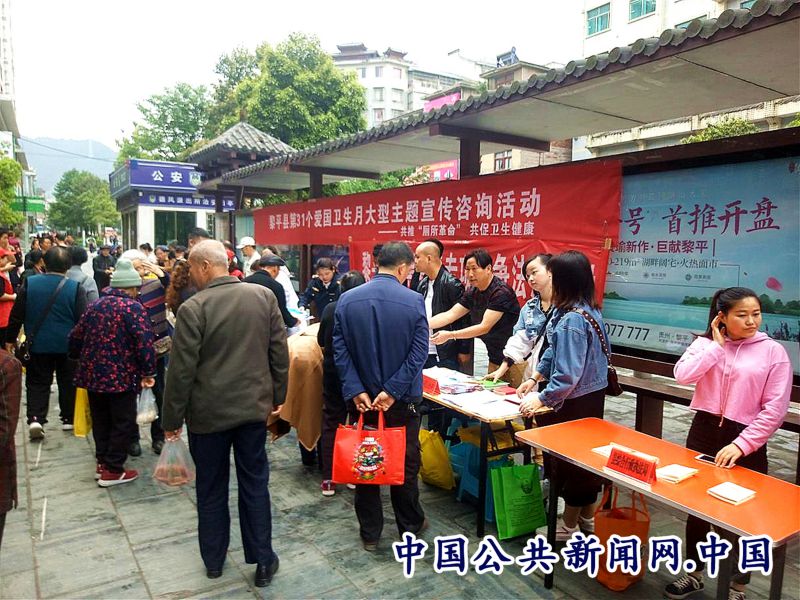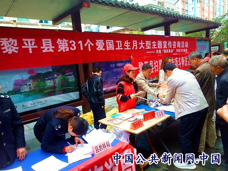 全民公众讯(姚进忠 岳龙)4月18日,黎平县爱卫办、卫生健康局、宣传部等40多家机关、事业单位在县城休闲广场集中开展以“共推厕所革命,共促卫生健康”为主题的第31个爱国卫生月大型宣传咨询一条街活动。